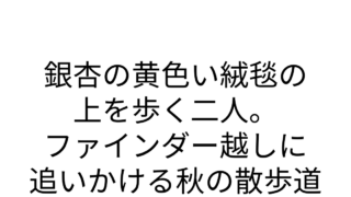 散歩の記録 銀杏の黄色い絨毯の上を歩く二人。ファインダー越しに追いかける秋の散歩道
